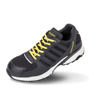 PU, leather and mesh upper. EN ISO 20345: 2011 S1P SRC. Lightweight low profile sports style. Breathable. Polycarbonate composite toe cap. Composite midsole for underfoot protection. EVA/rubber sole. Scuff cap. SRC slip resistance. Anti-static. Reflective detail. Padded tongue. Comes with spare laces, black/grey, yellow/black and black.